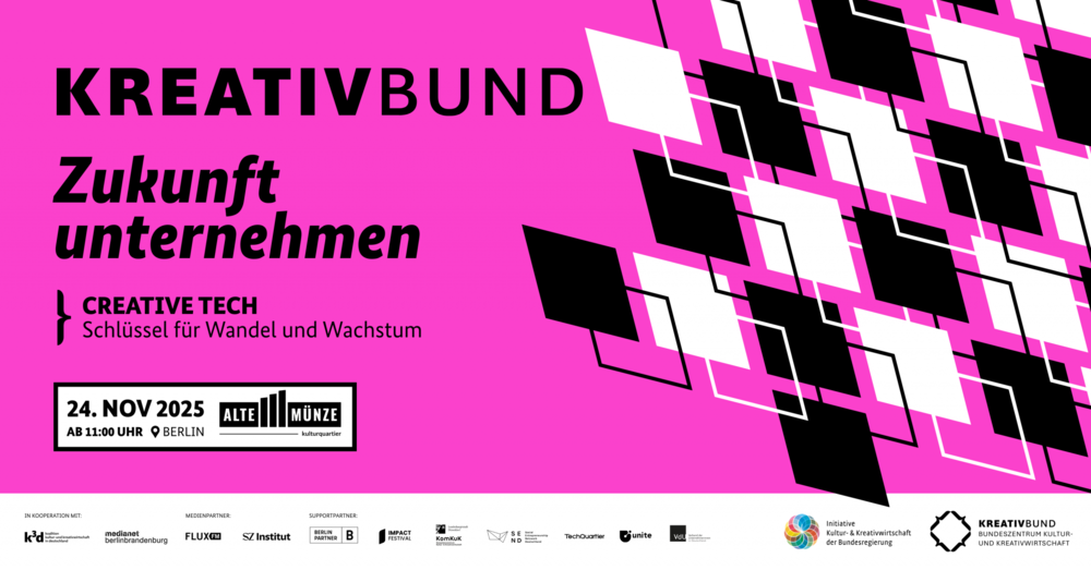 Dies sind zentrale Forderungen eines Positionspapiers, das die Koalition Kultur- und Kreativwirtschaft in Deutschland (k3d) zum Kongress „Zukunft unternehmen“ von KreativBund – Bundeszentrum Kultur- und Kreativwirtschaft – am 24. November in Berlin veröffentlicht hat. Als Gastgeber des Kongresses waren unter anderem der Staatsminister für Kultur und Medien (BKM), Dr. Wolfram Weimer, sowie die Parlamentarische Staatssekretärin im Bundesministerium für Wirtschaft und Energie (BMWE), Gitta Connemann, vor Ort. k3d ist Kooperationspartner der Veranstaltung.