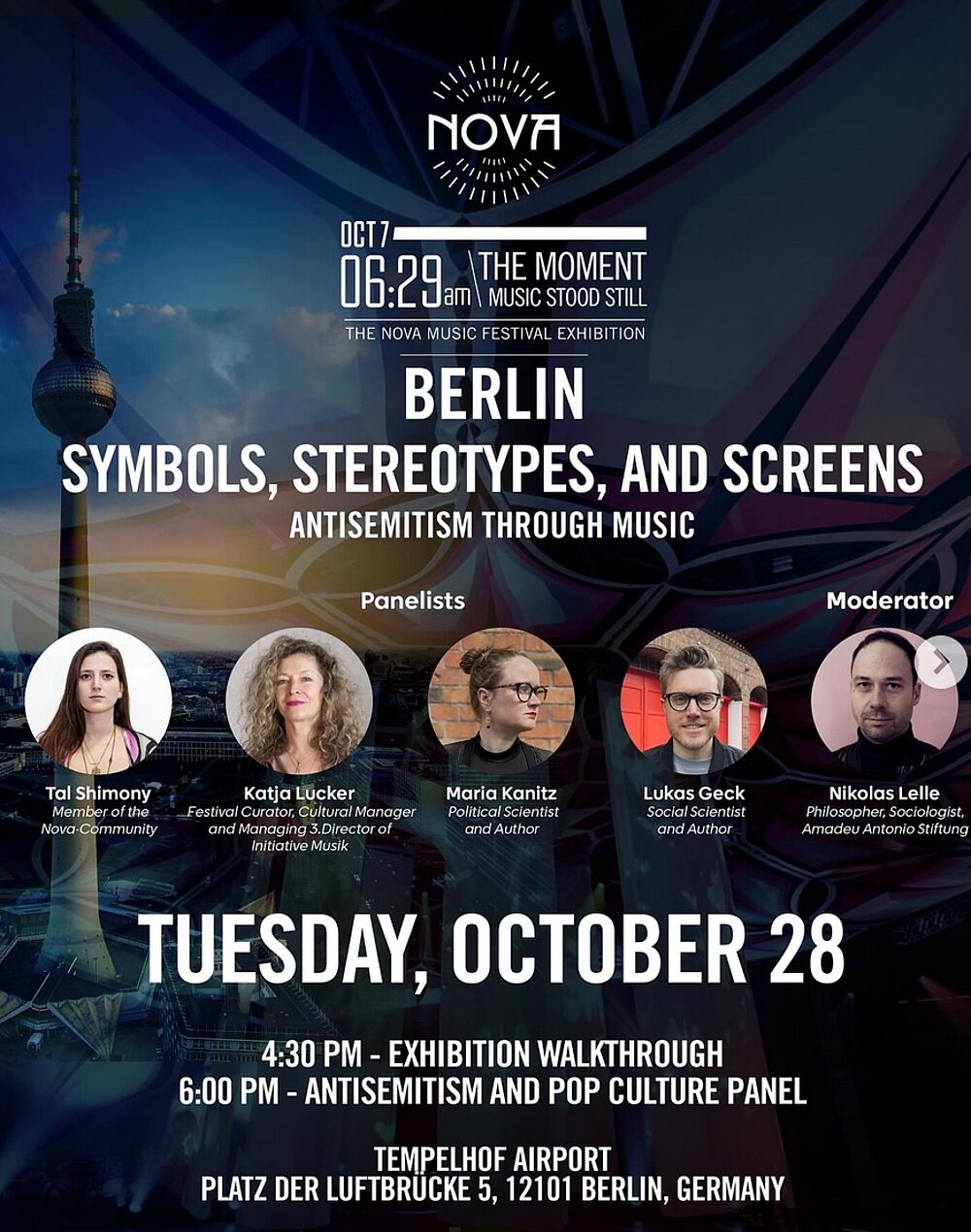 Der Tagesspiegel schreibt dazu: Noch hingehen – Zurückgelassene Rucksäcke, ausgebrannte Autos, Handyvideos: Mit einer aufwühlenden Ausstellung erinnern die Veranstalter des Nova Music Festivals an den 7. Oktober 2023. Beim Überfall der Hamas auf Besucher:innen des Nova-Festivals im Süden Israels ermordeten Terroristen Hunderte Festivalbesucher, vergewaltigten und verschleppten Dutzende Geiseln. Für die Ausstellung (noch bis 16.11.) wurde das Festivalgelände rekonstruiert; zu sehen sind Zeugnisse der Geschehens, persönliche Erinnerungsstücke und Berichte von Überlebenden, abgeschlossen wird sie mit einem Raum der Heilung. Di-Do und Sa/So 11-20 Uhr, Fr 11-18 Uhr, ab 7,40 Euro, Flughafen Tempelhof, Platz der Luftbrücke 5, U-Bhf Platz der Luftbrücke